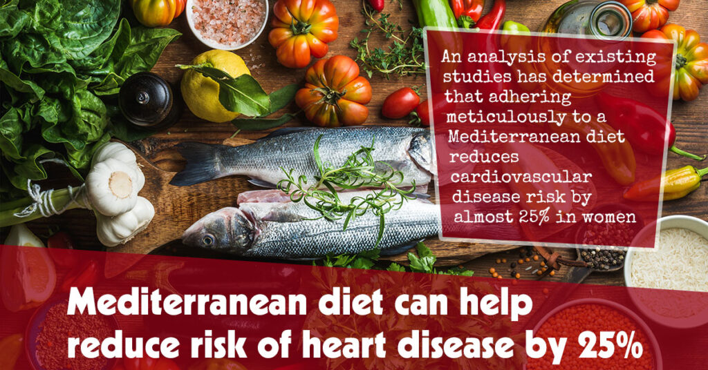 An analysis of existing studies has determined that adhering meticulously to a Mediterranean diet reduces cardiovascular disease risk as well as death by almost 25% in women.